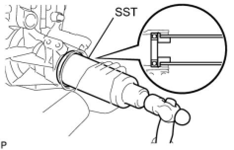 (b) Using SST and a hammer, tap in the oil seal until it fits with the transmission case.