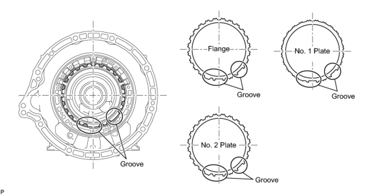 Assemble the transmission case, flanges and plates by aligning their grooves as shown in the illustration.