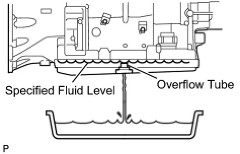 If the ATF does not flow from the overflow tube, add ATF into the refill hole until ATF flows from the overflow tube. If the ATF flows in a thin stream, the fluid amount is normal.