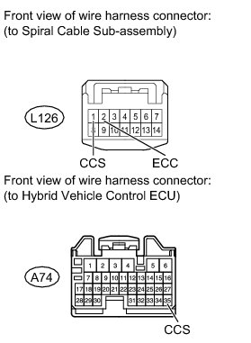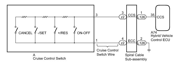 This circuit sends a signal to the hybrid vehicle control ECU depending on the cruise control switch condition. The battery supplies positive (+) battery voltage to the circuit control switch. Then terminal CCS of the hybrid vehicle control ECU receives the voltage according to the switch condition.