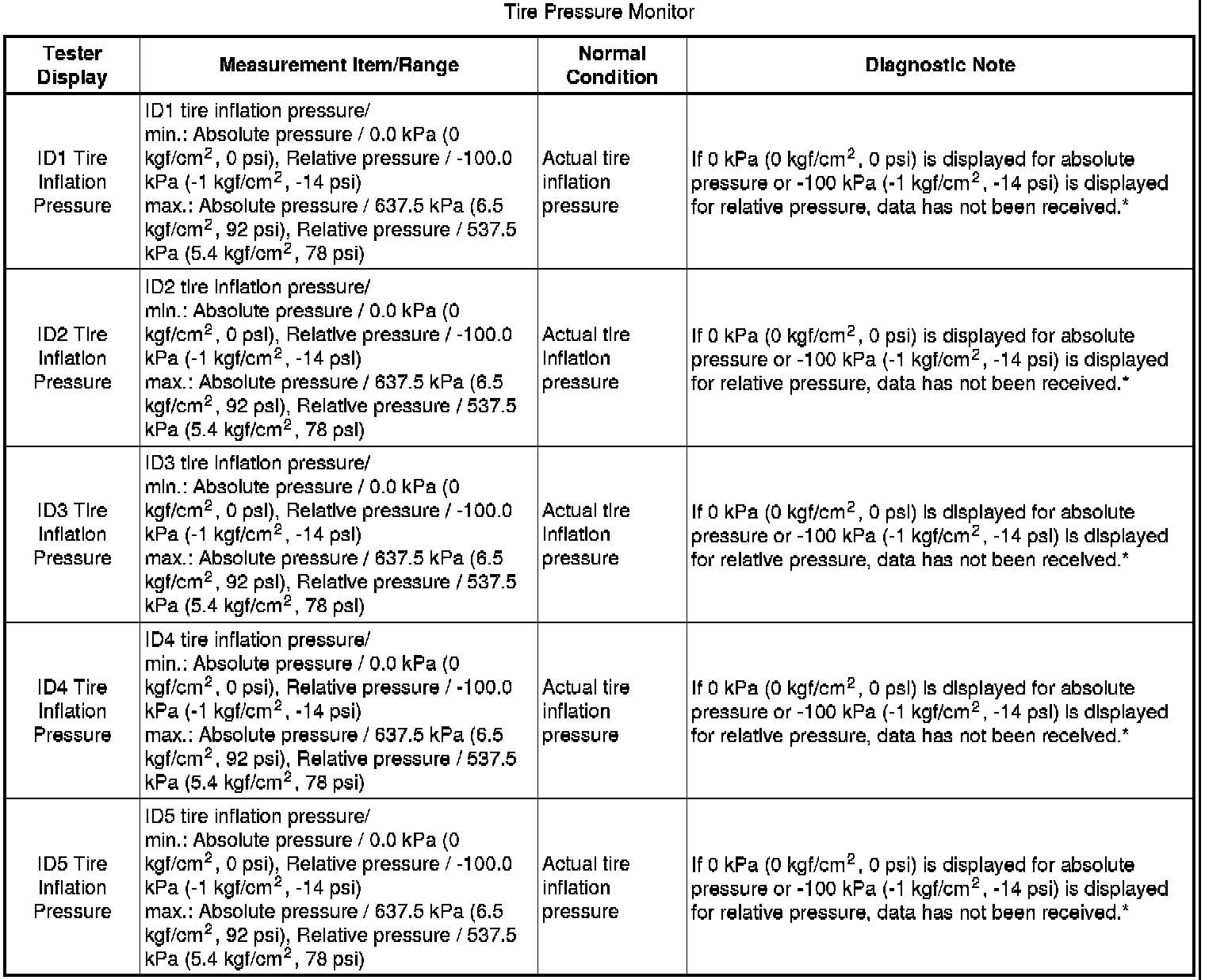 * The initialization is complete when the Data List "ID Tire Inflation Pressure" display shows the correct pressures.
