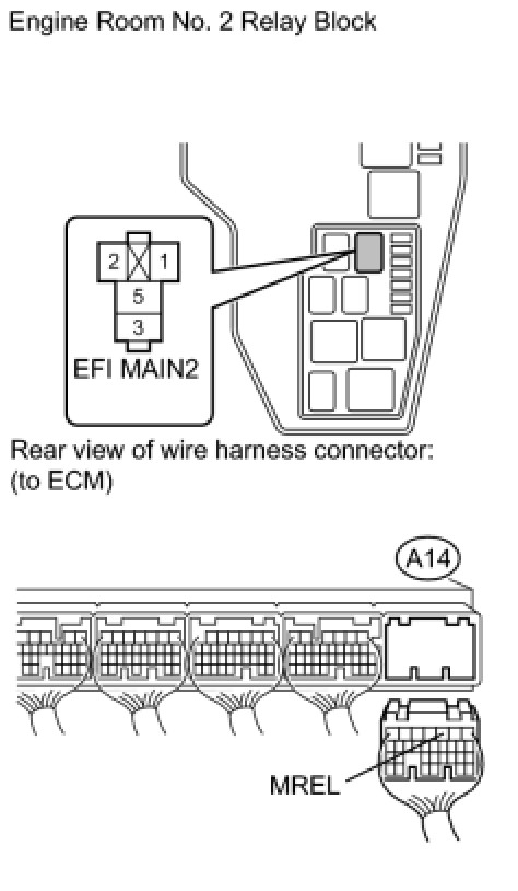 (1) Remove the EFI MAIN2 relay from the engine room No. 2 relay block.