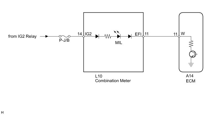 The MIL (Malfunction Indicator Lamp) is used to indicate vehicle malfunction detections by the ECM. By turning the power switch on (IG), power is supplied to the MIL circuit, and the ECM provides the circuit ground which illuminates the MIL.