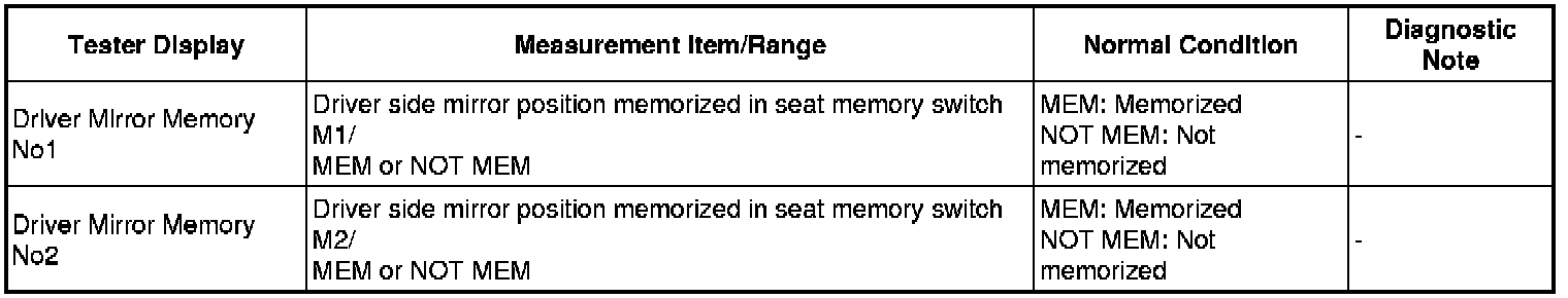 When the seat memory M1 or M2 switch is pressed, the multiplex network door ECU front LH (driver door ECU) sends a memory switch status signal to the position control ECU (for driver side). Then the position control ECU sends the following to the door ECU front LH and RH: 1) a memory M1 or M2 memory recall signal, and 2) a driver and front passenger seat mirror position memory recall signal recorded in memory. When the door ECU front LH and RH receive the memory M1 or M2 memory recall signal, and then receive the driver and front passenger seat mirror position memory recall signal within 1.2 seconds, the door ECU front LH and RH activate the mirror control motors to move the mirrors to the previously recorded positions.