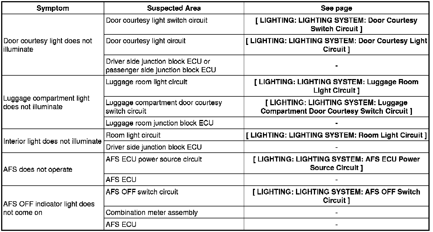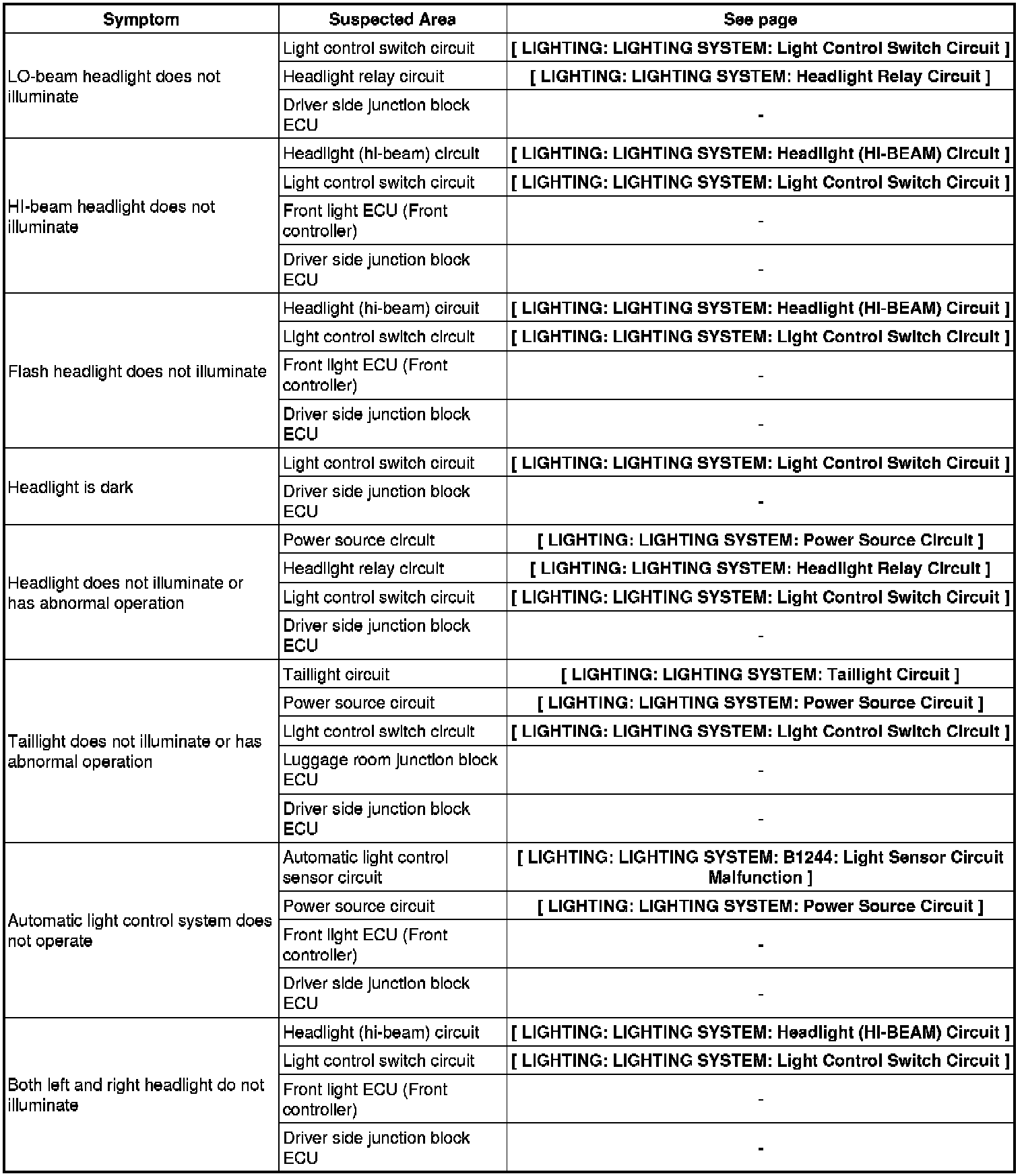 LIGHTING: LIGHTING SYSTEM: PROBLEM SYMPTOMS TABLE