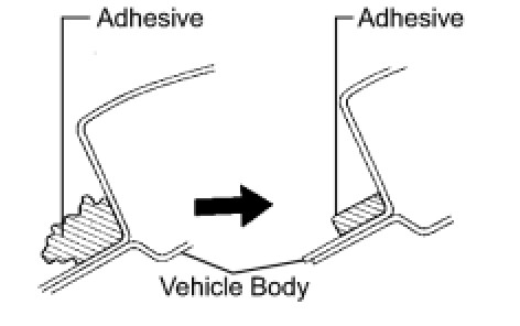 (1) On the contact surface of the vehicle body, use a knife to cut away excess adhesive as shown in the illustration.