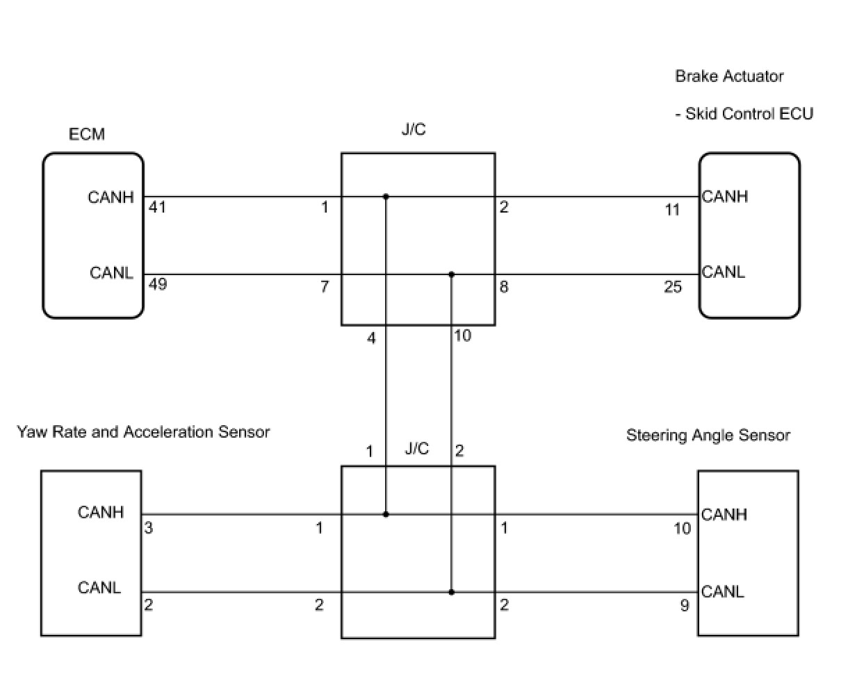 The skid control ECU receives the signals from the ECM, steering angle sensor, and yaw rate and acceleration sensor via the CAN communication system.