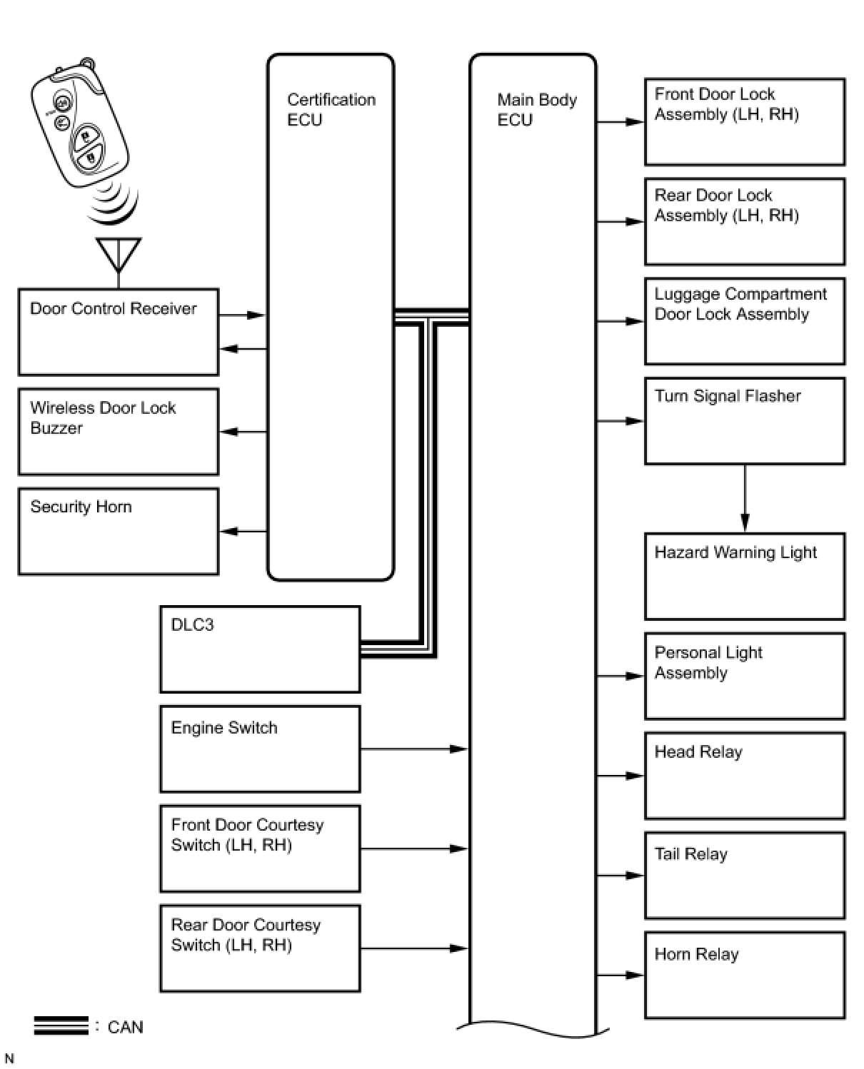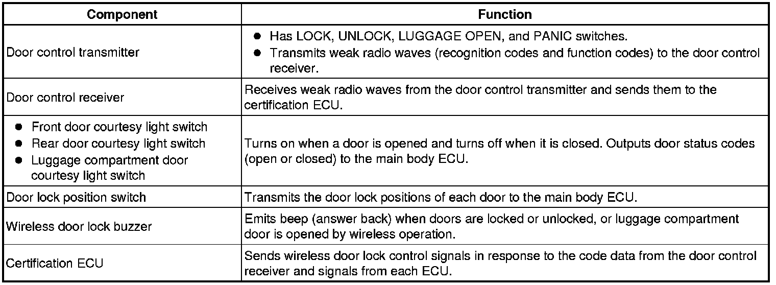 The wireless door lock control system functions to lock and unlock all the doors from a distance. The system is controlled by a hand-held transmitter which sends radio waves to the door control receiver. The certification ECU performs an ID code identification process and engages the door lock control.