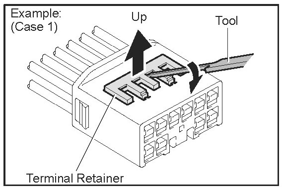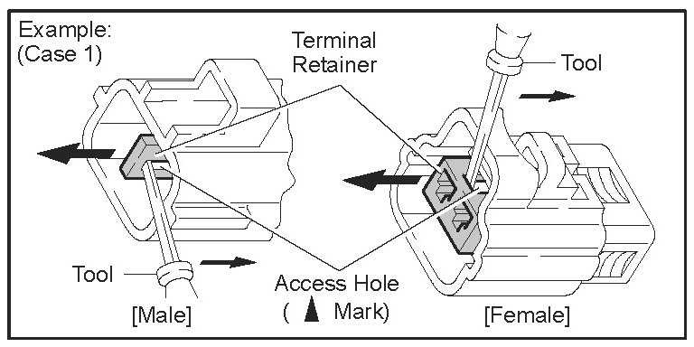 Insert the special tool into the terminal retainer access hole (Triangle Mark) and pull the terminal retainer up to the temporary lock position.