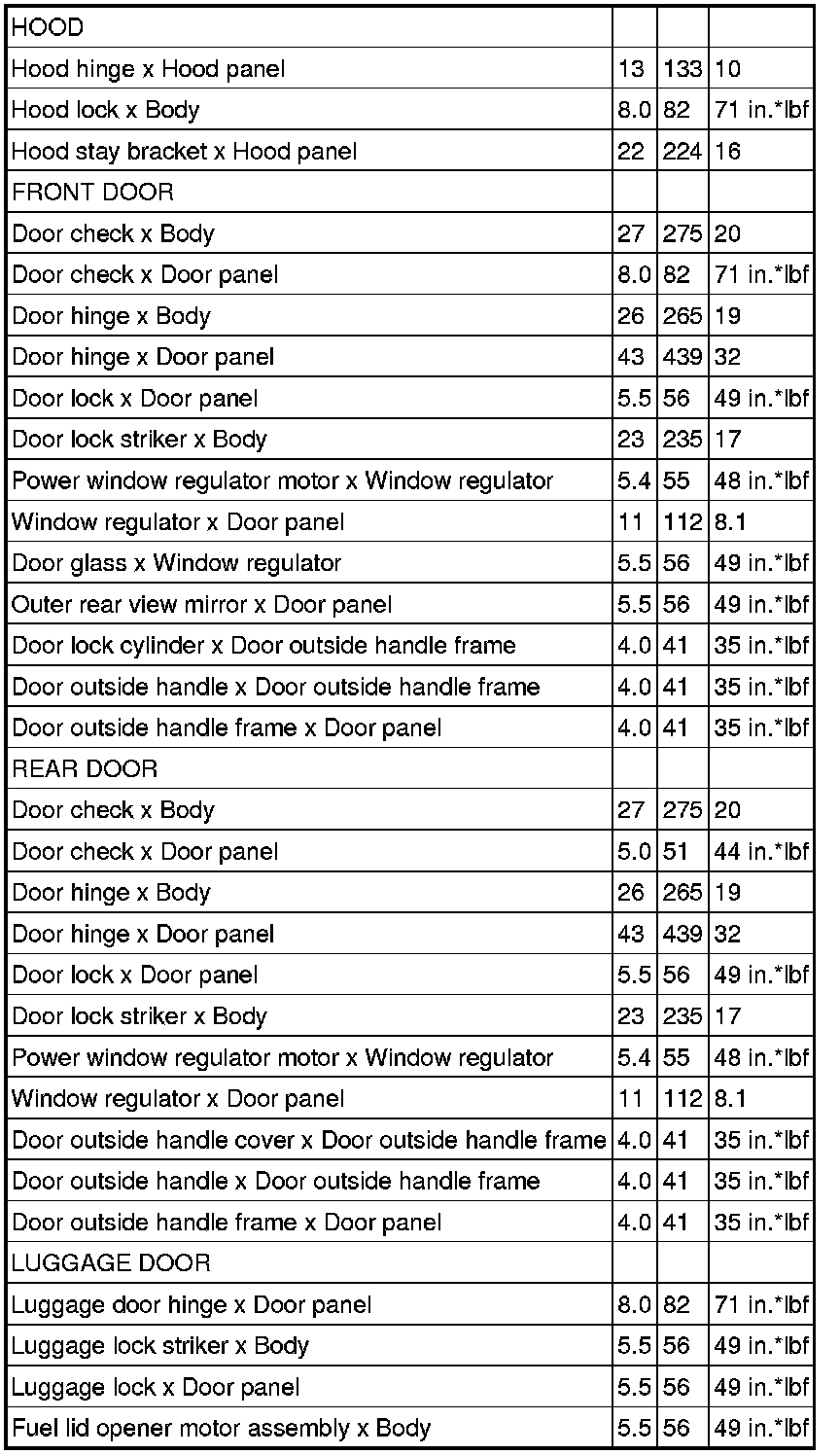 / DOOR: TORQUE SPECIFICATIONS