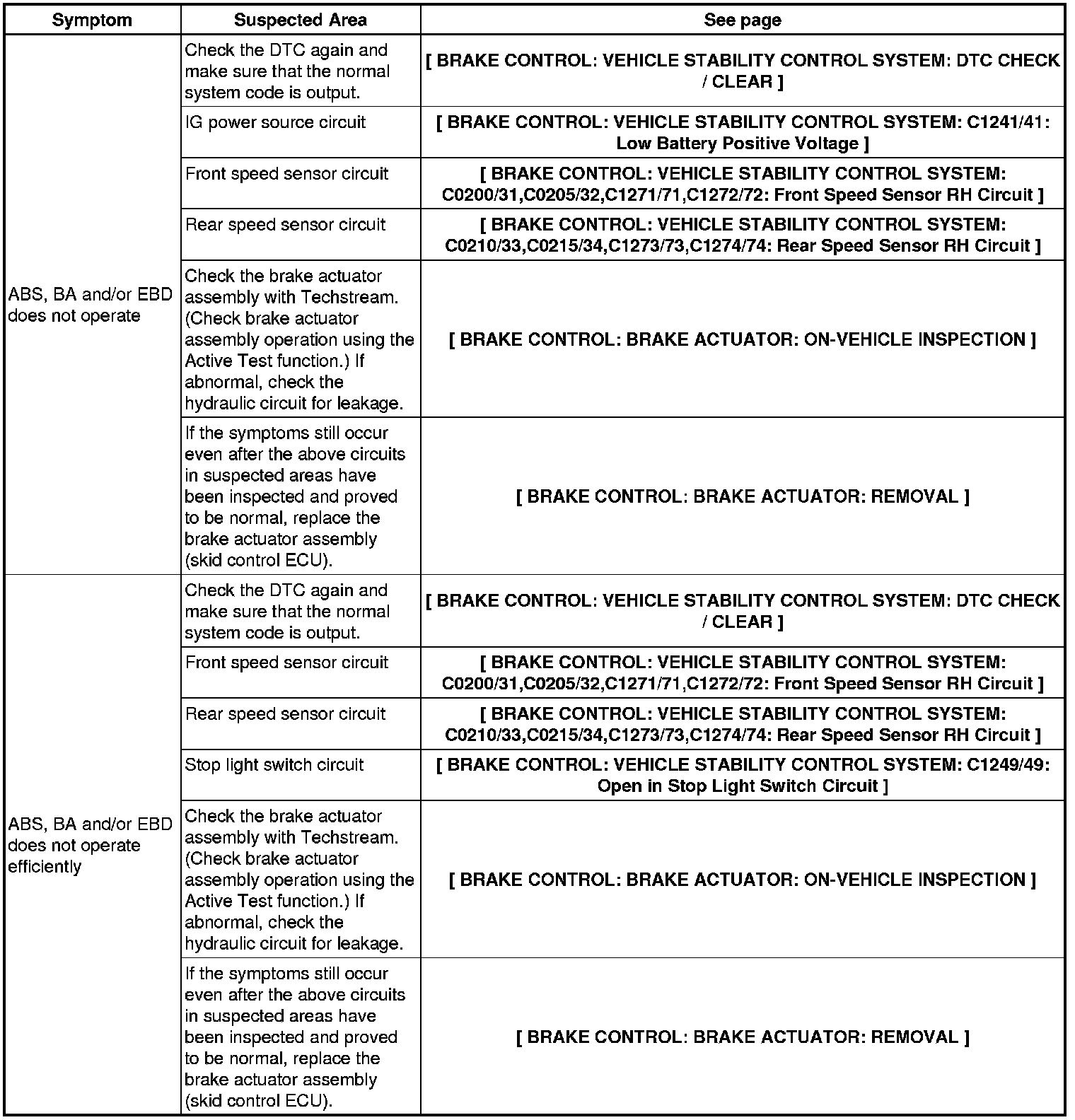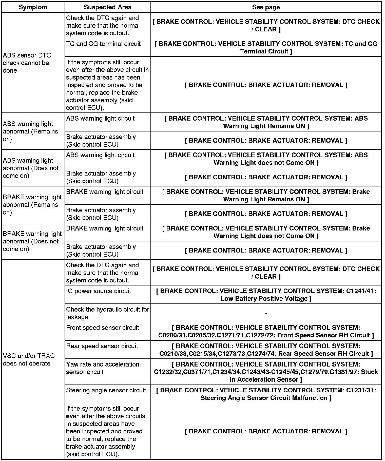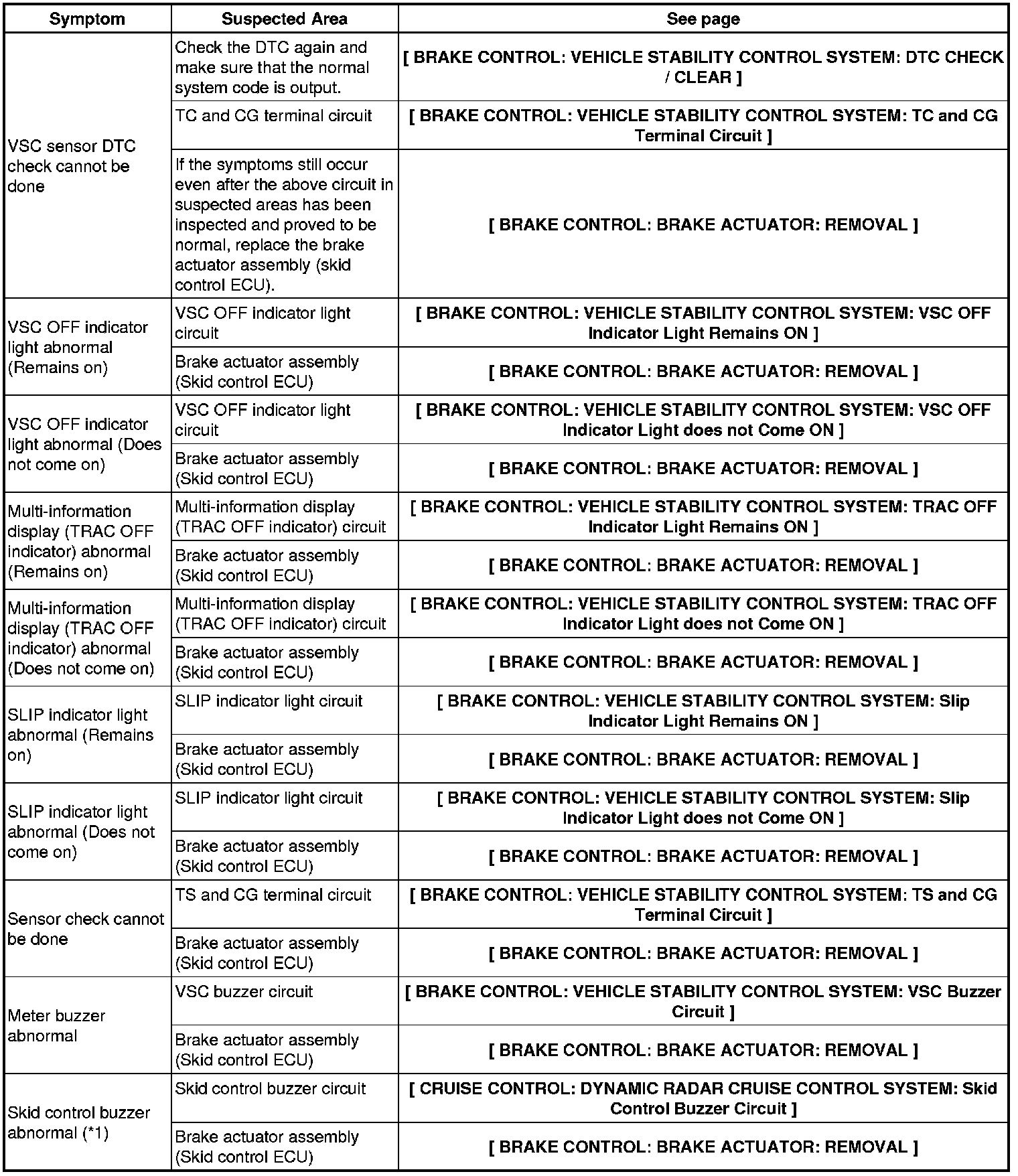 BRAKE CONTROL: VEHICLE STABILITY CONTROL SYSTEM: PROBLEM SYMPTOMS TABLE