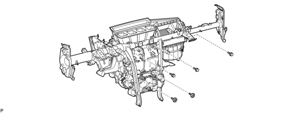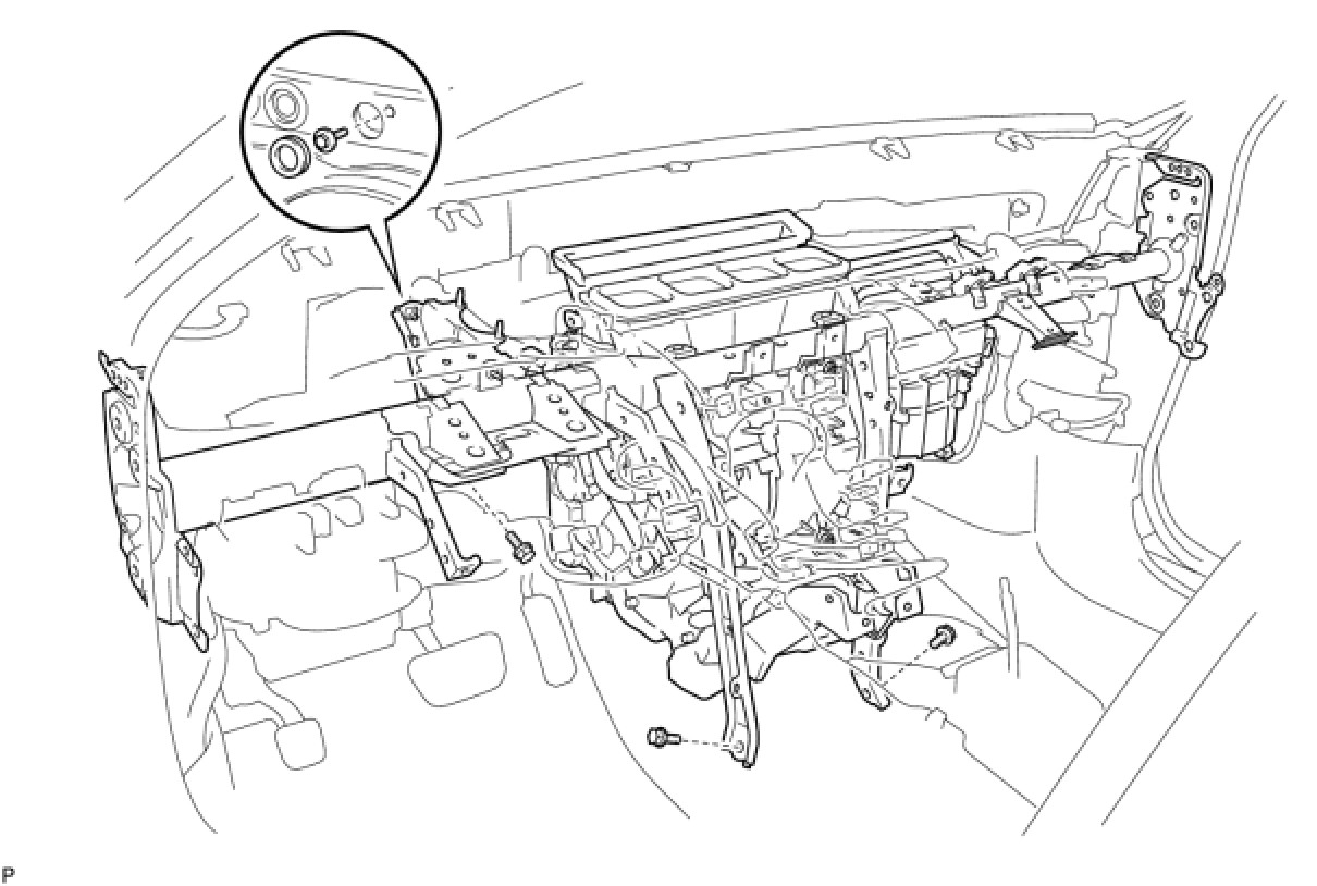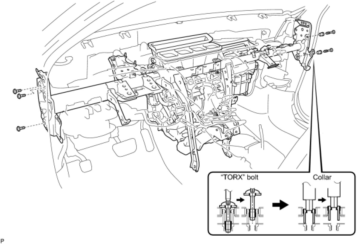 (f) Using a hexagon wrench 12 mm, remove the 2 collars and instrument panel reinforcement assembly with the air conditioner unit assembly.
