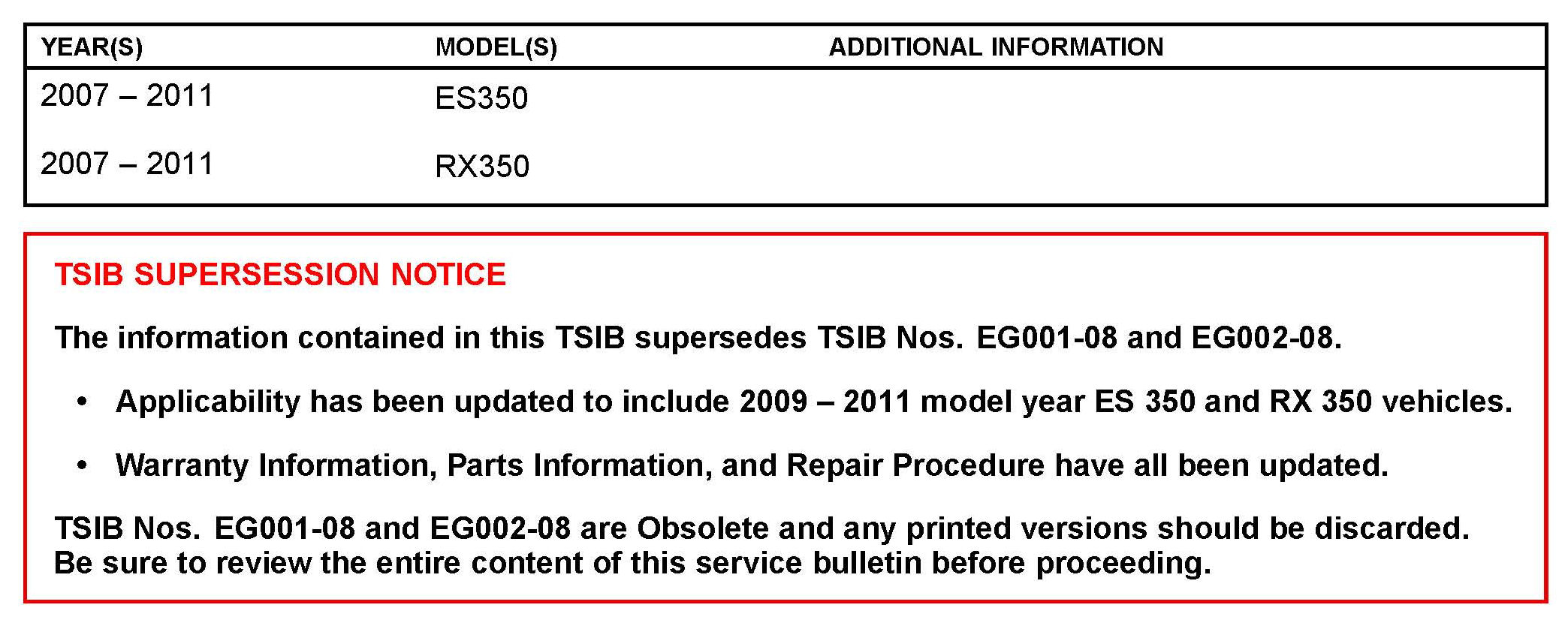 Some 2007 - 2011 model year ES 350 and RX 350 vehicles may exhibit a MIL "ON" condition with one or more VVT-i related Diagnostic Trouble Codes (DTCs) stored in the Engine Control Module or ECM (SAE term: Powertrain Control Module/PCM). Please use the following repair procedure to address this condition.