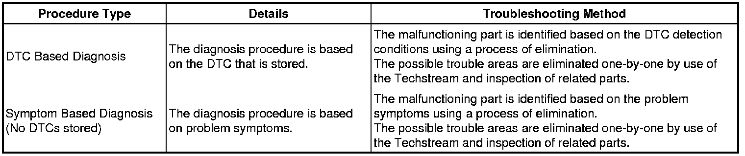 * The troubleshooting procedures consist of diagnosis procedures for when a DTC is stored and diagnosis procedures for when no DTC is stored. The basic idea is explained in the following table.