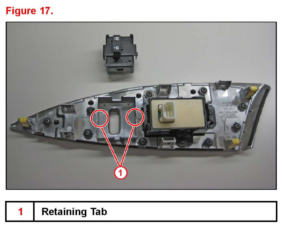 9. Fully seat the two retaining tabs and install the power door lock switch assembly.