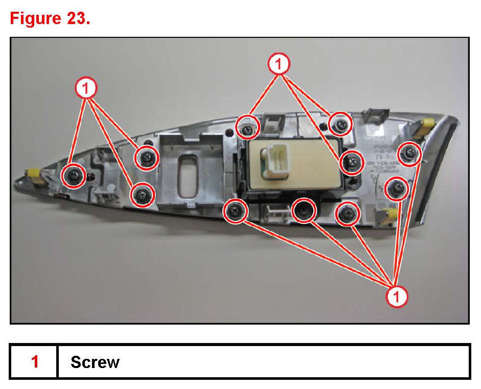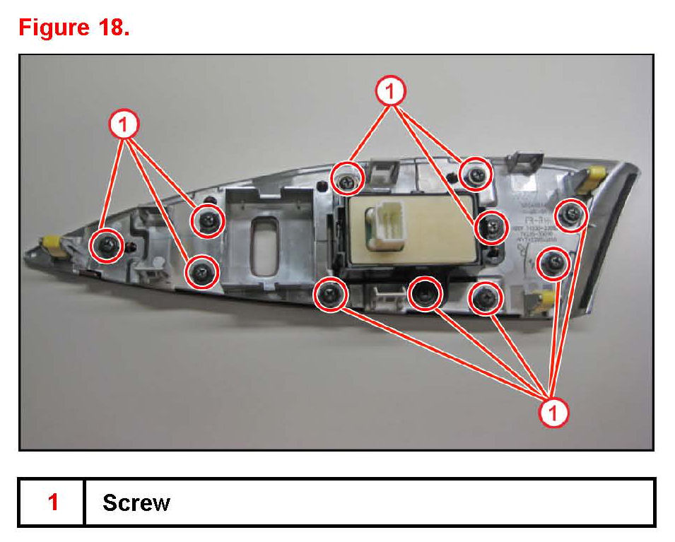 A. Using a pry tool disengage the 5 claws and 3 clips disconnect the connector and remove the front door switch base assembly.