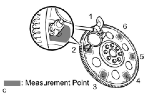 (b) Set up a dial indicator and measure the runout of the 6 portions around the torque converter fitting surfaces.