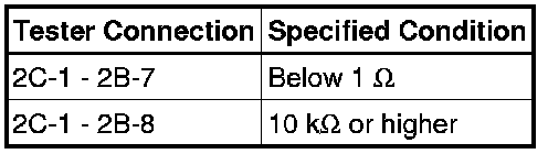 (2) Connect the battery's positive (+) lead to terminal 2A-8 and negative (-) lead to terminal 2B-3. Measure the resistance between terminals 2B-7 and 2C-1 when battery voltage is applied between the terminals.