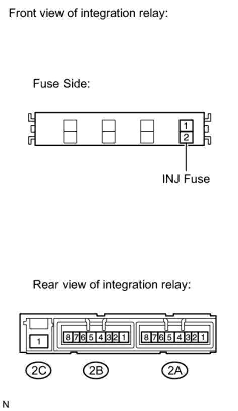 (2) Connect the battery's positive (+) lead to terminal 2A-1 and negative (-) lead to terminal 2A-3. Measure the resistance between the INJ fuse terminals 2 and terminal 2A-4 when battery voltage is applied between the terminals.