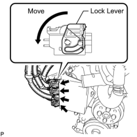 (1) Connect the 3 connectors with wire harness locks and the connector to the injector driver. Move the lock lever in the direction indicated by the arrow to lock the connector.