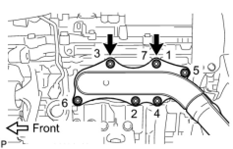Install the exhaust manifold to the cylinder head with the 6 nuts in the order shown in the illustration.