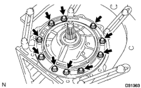 (a) Remove the 10 bolts from the transmission case.