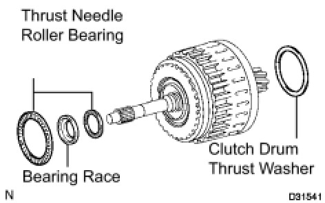 (b) Remove the clutch drum thrust washer, 2 thrust needle roller bearings and bearing race.