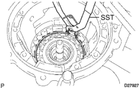 (a) Using SST, remove the snap ring from the transmission case.
