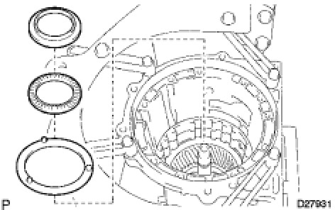 (a) Remove the center planetary gear assembly, the planetary sun gear and the thrust bearing race No.4 from the transmission case.