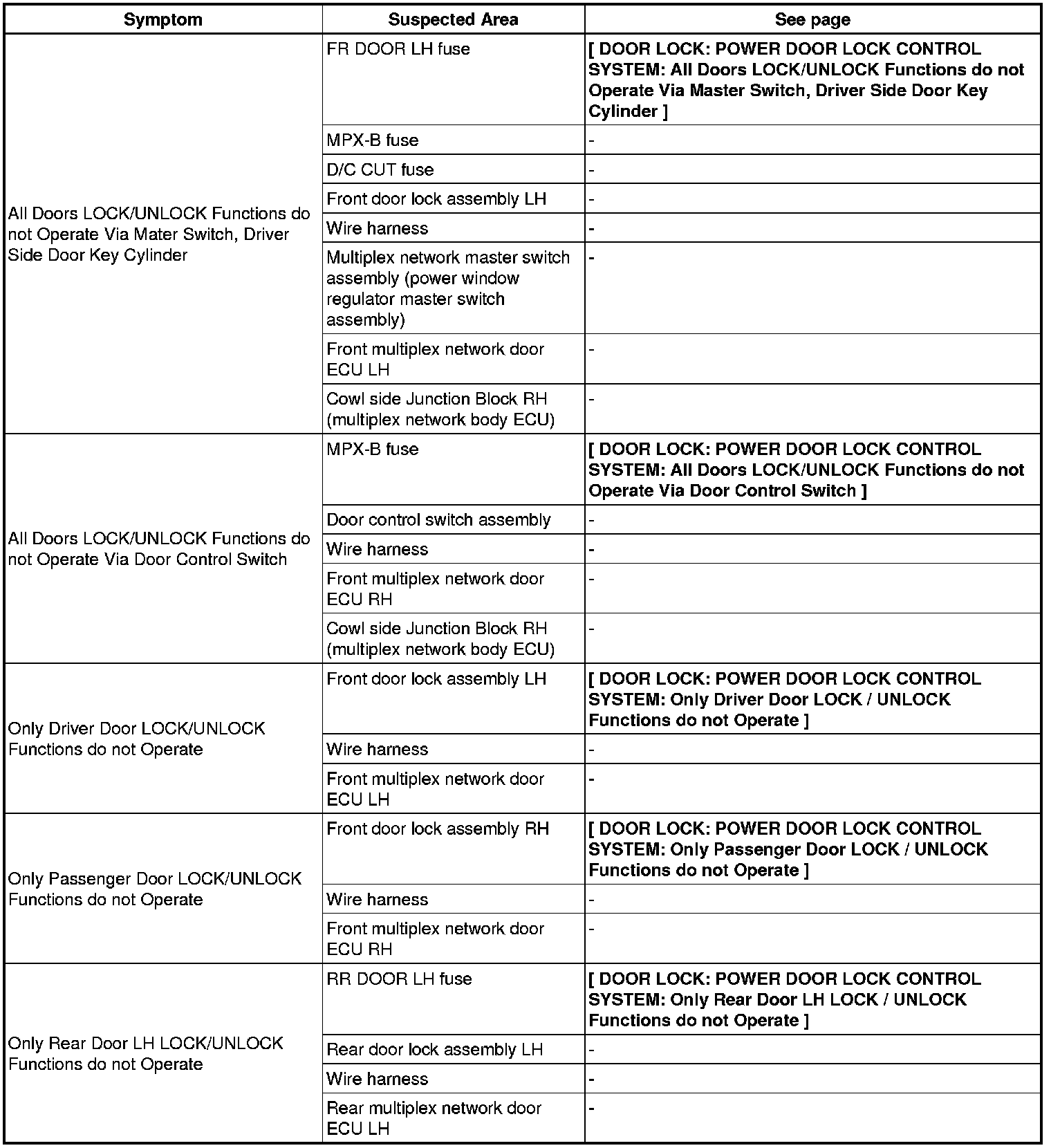 DOOR LOCK: POWER DOOR LOCK CONTROL SYSTEM: PROBLEM SYMPTOMS TABLE