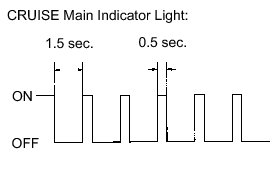 While driving with cruise control, the ECM activates AUTO CANCEL of the cruise control system when a malfunction in one of the following occurs: vehicle speed sensors, stop light switch or other related parts. When AUTO CANCEL is activated, the CRUISE main indicator light outputs the blinking pattern shown to the left. At the same time, data of the malfunction is stored as a DTC.