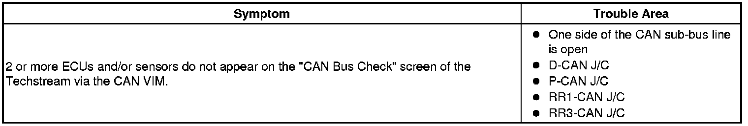 If 2 or more ECUs and/or sensors do not appear on the "CAN Bus Check" screen of the Techstream, one side of the CAN sub-bus line may be open. (One side of the CAN-H [sub-bus line] / CAN-L [sub-bus line] of the ECU and/or sensor is open.)