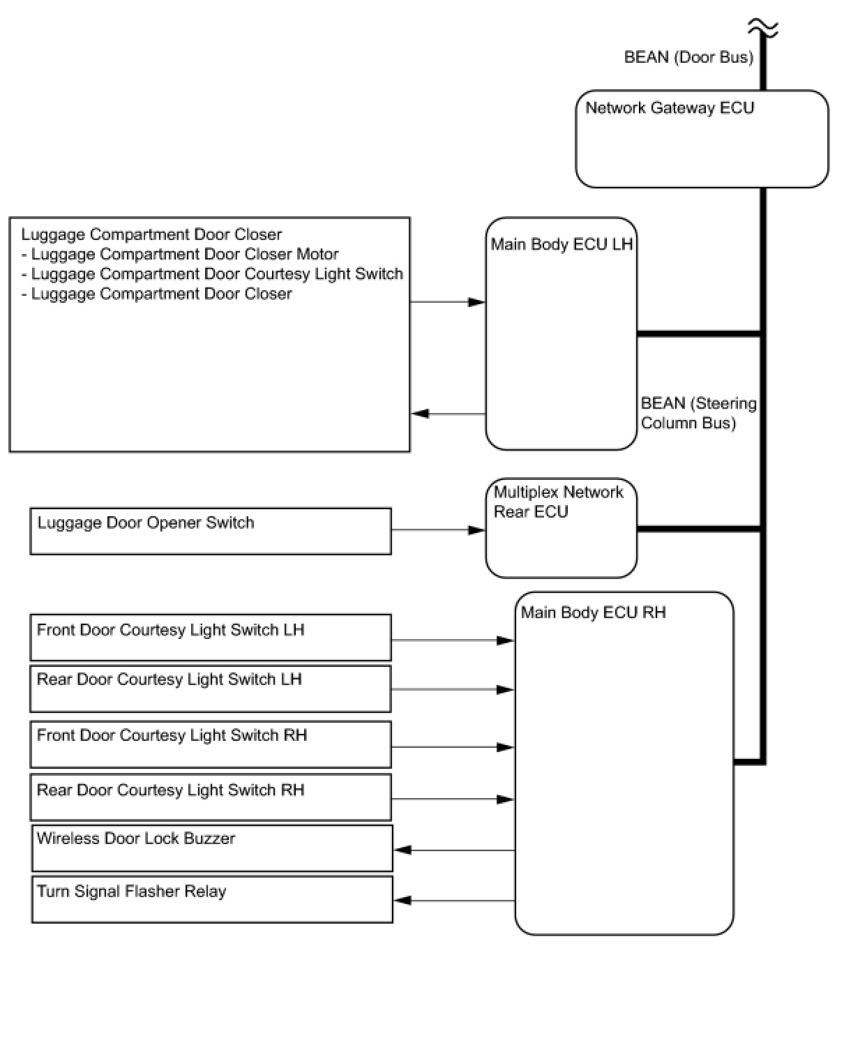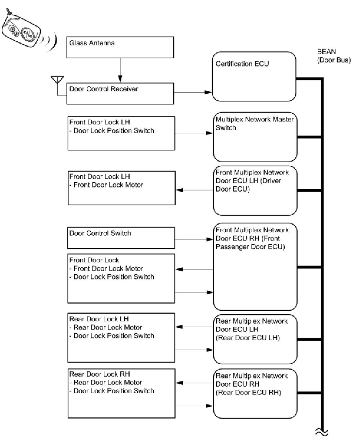 With the power switch OFF and all door courtesy light switches off, pressing the door control transmitter's LOCK / UNLOCK switch causes the transmitter to output weak electric waves, which are then input to the door control receiver. The door control receiver converts these waves into code data (recognition codes and function codes) in its internal high frequency circuit, and outputs its evaluation results to the main body ECU RH. Upon receiving a door locks / unlock request signal, the main body ECU RH outputs a door lock / unlock control signal to each door ECU. Each door ECU outputs a door lock / unlock control signal to each door lock motor. Each door lock then locks /unlocks its door and turn on/off its lock position switch according to the signals.