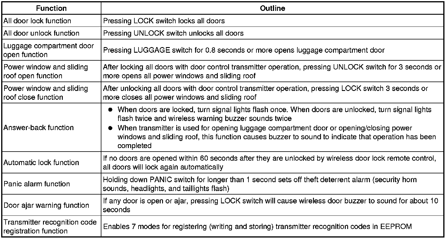 * A key-integrated type transmitter is used and it contains the following 4 switches: LOCK switch, UNLOCK switch, LUGGAGE switch and PANIC switch.