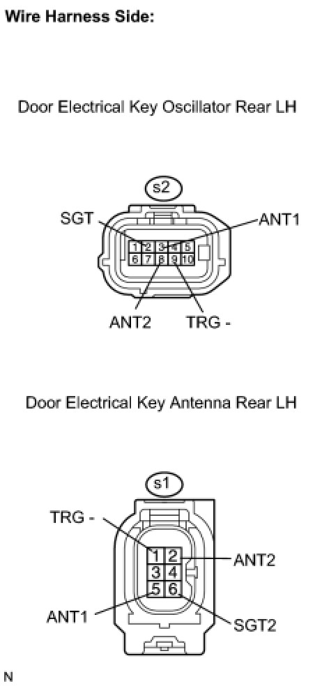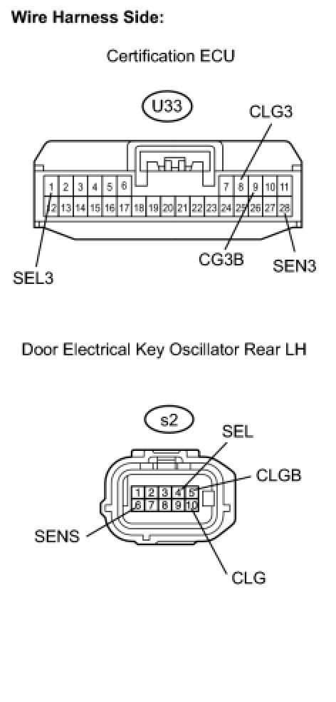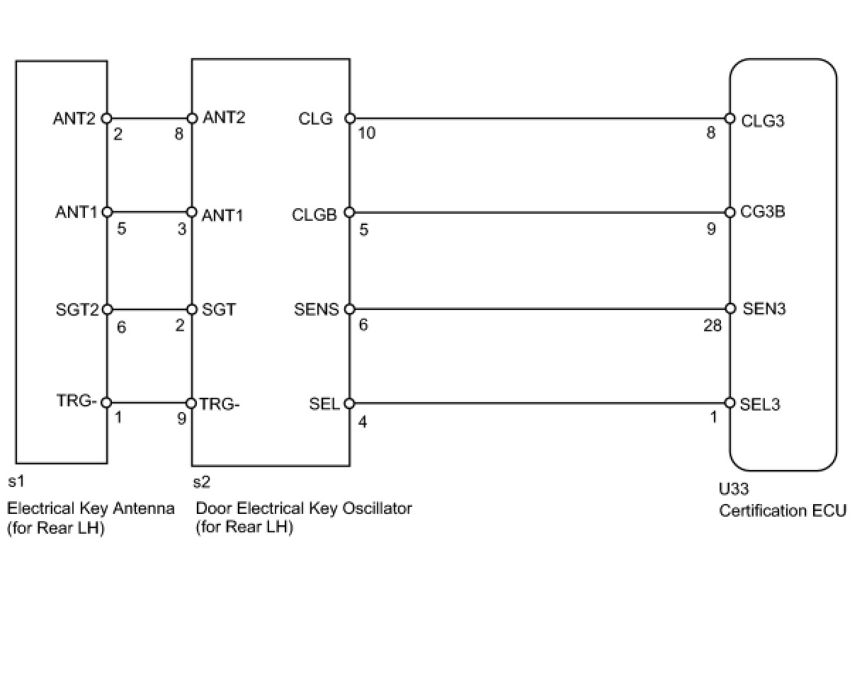 When an ID code from the door electrical key oscillator rear LH matches an ID code from the key, the certification ECU outputs a SEL signal (Lo when output) to the door electrical key oscillator rear LH, activates the touch sensor inside the outside door handle, and enters unlock standby mode. When the touch sensor is touched, the door electrical key oscillator rear LH sends a SENS signal (Lo when output) to the certification ECU and the certification ECU sends an unlock signal to the rear door LH lock.