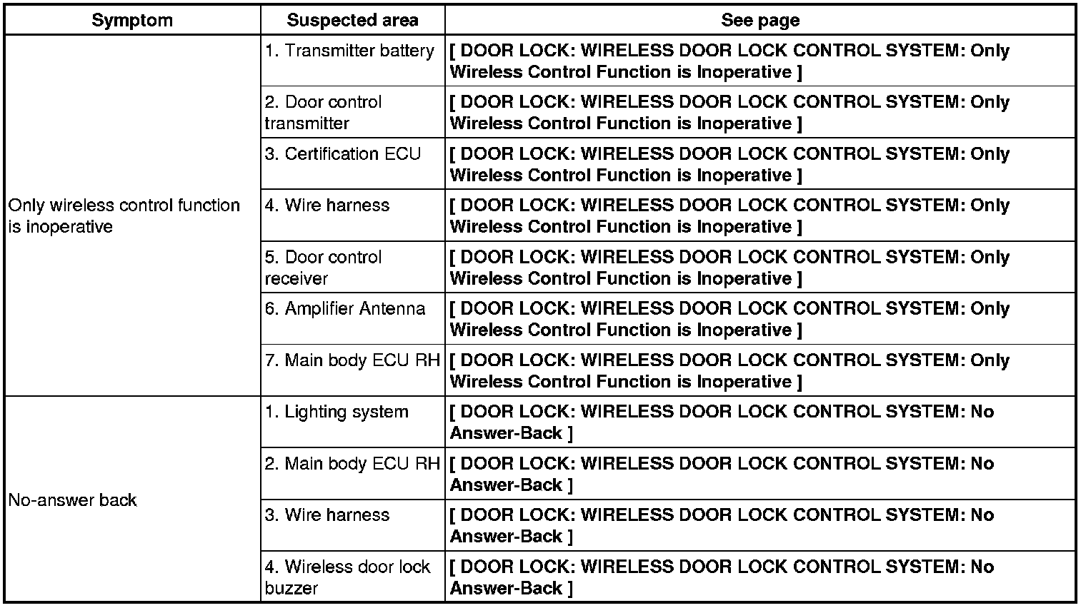 DOOR LOCK: WIRELESS DOOR LOCK CONTROL SYSTEM: PROBLEM SYMPTOMS TABLE