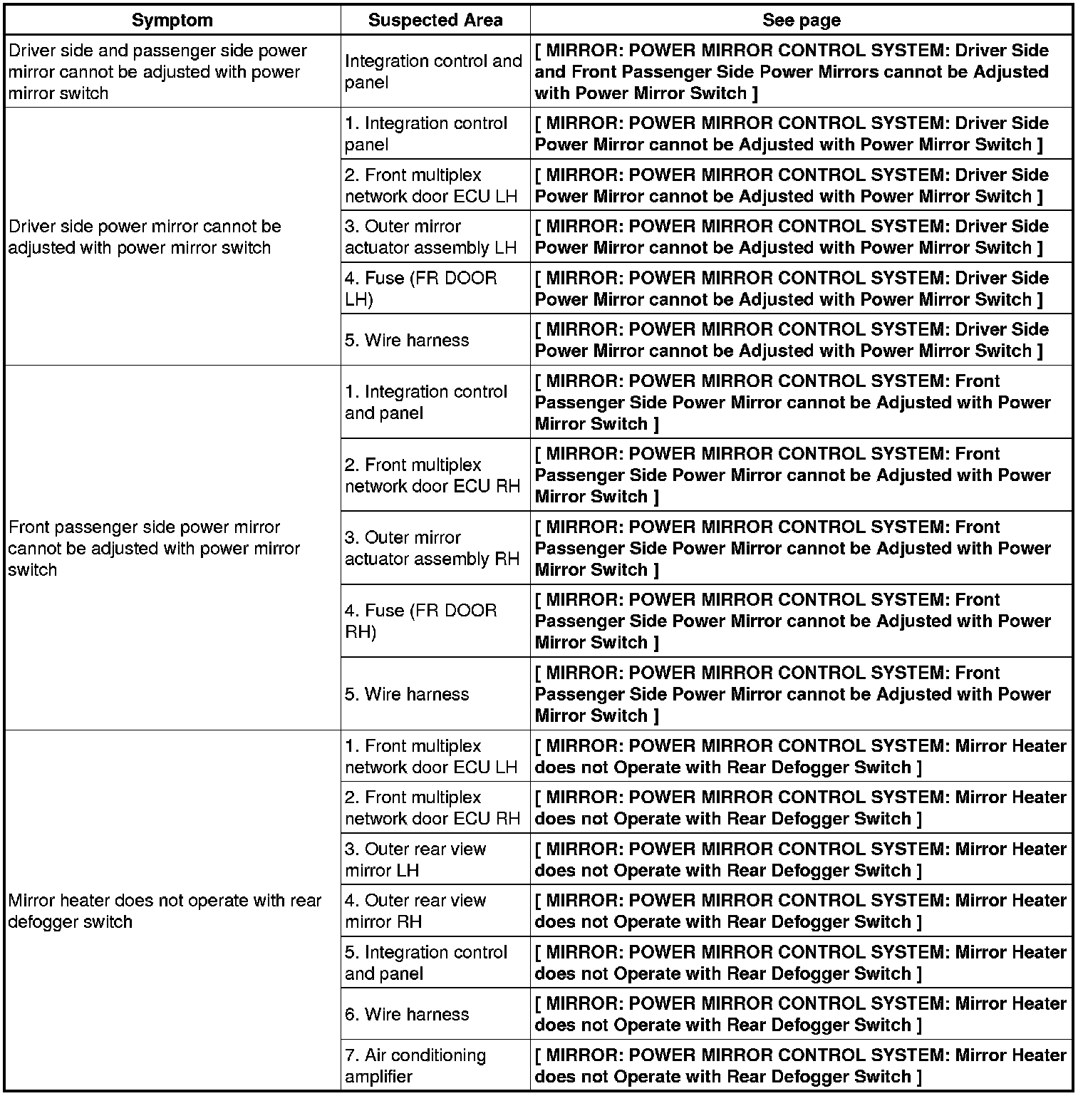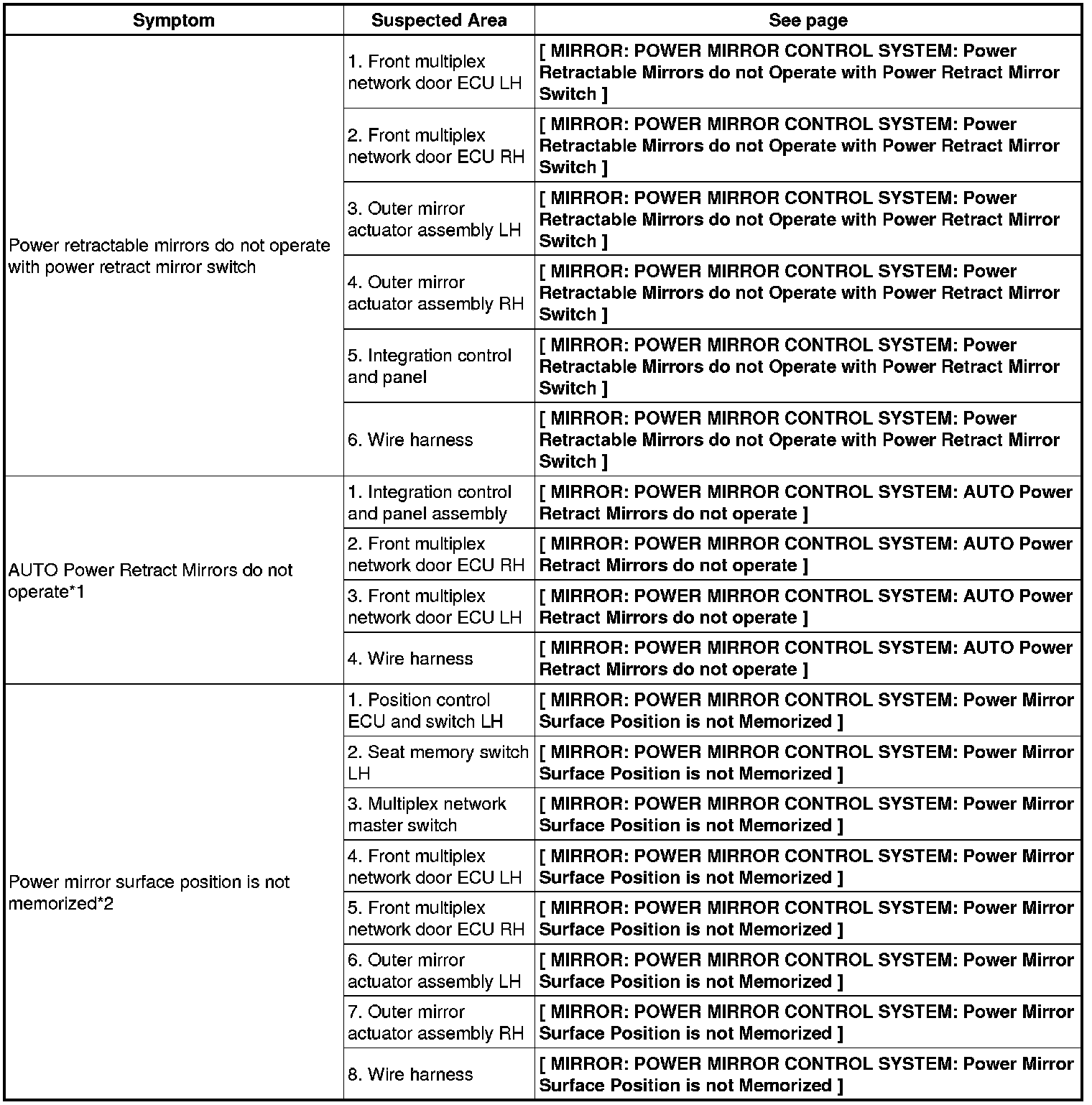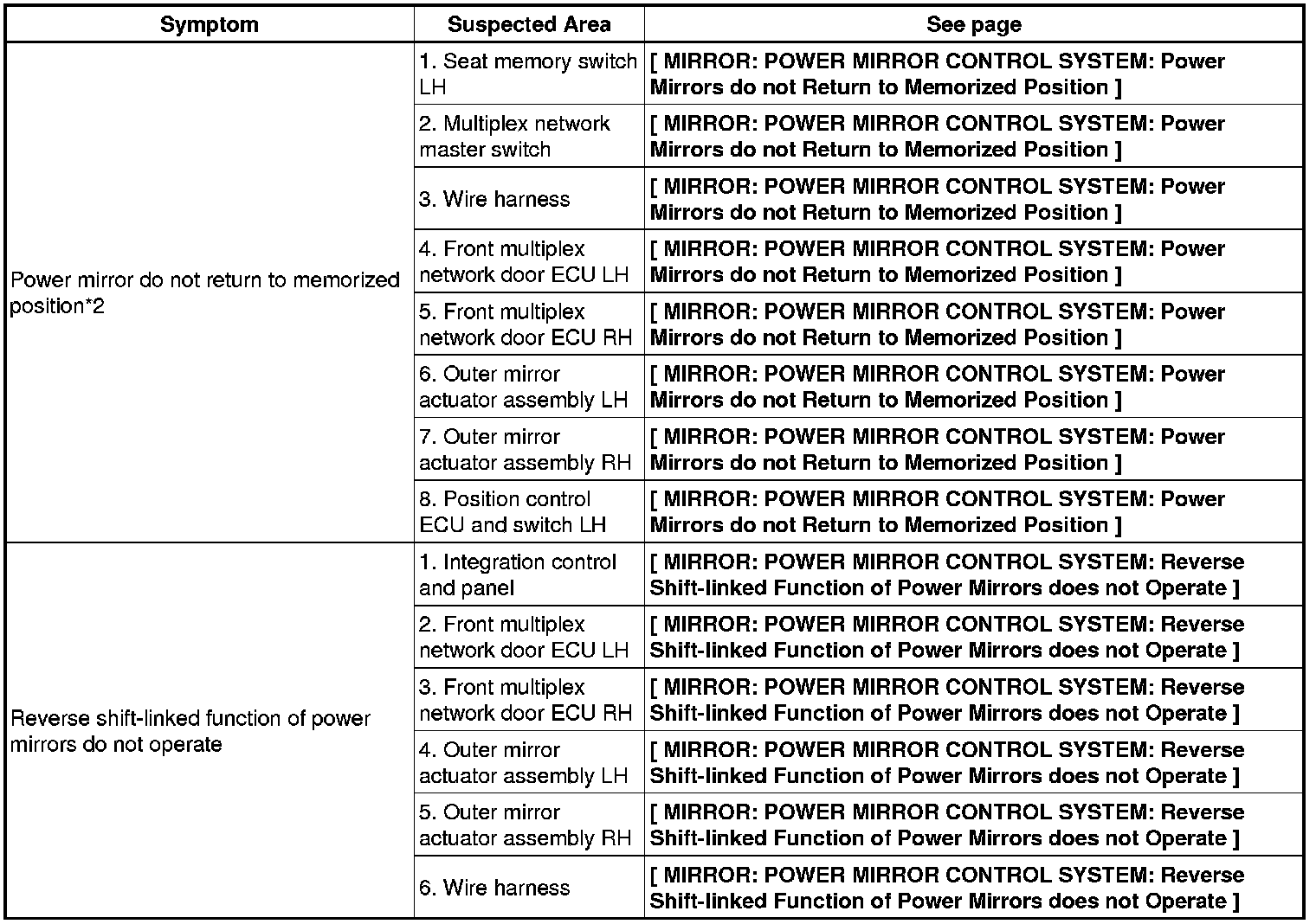 MIRROR: POWER MIRROR CONTROL SYSTEM: PROBLEM SYMPTOMS TABLE