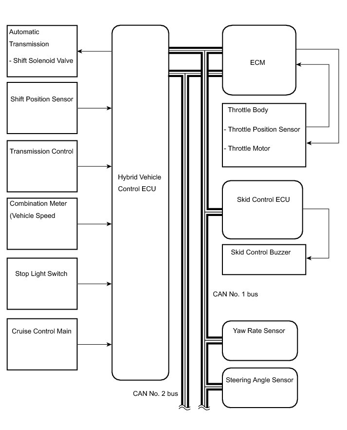 When the cruise control main switch is set to SET / COAST and held in that position while the cruise control system is operating, the hybrid vehicle control ECU sends a "throttle valve opening angle 0°" demand signal to the cruise control system. Then the vehicle speed, when the cruise control main switch is released, is stored and maintained.
