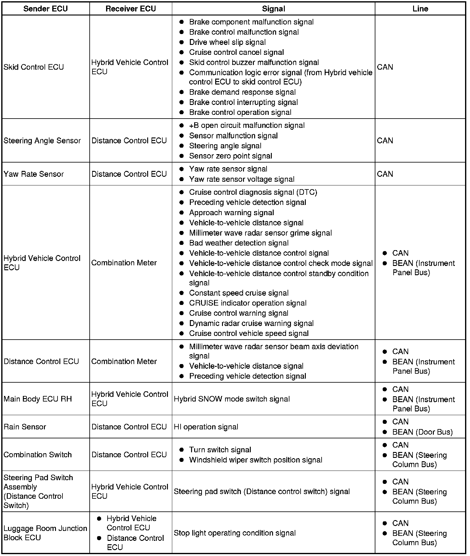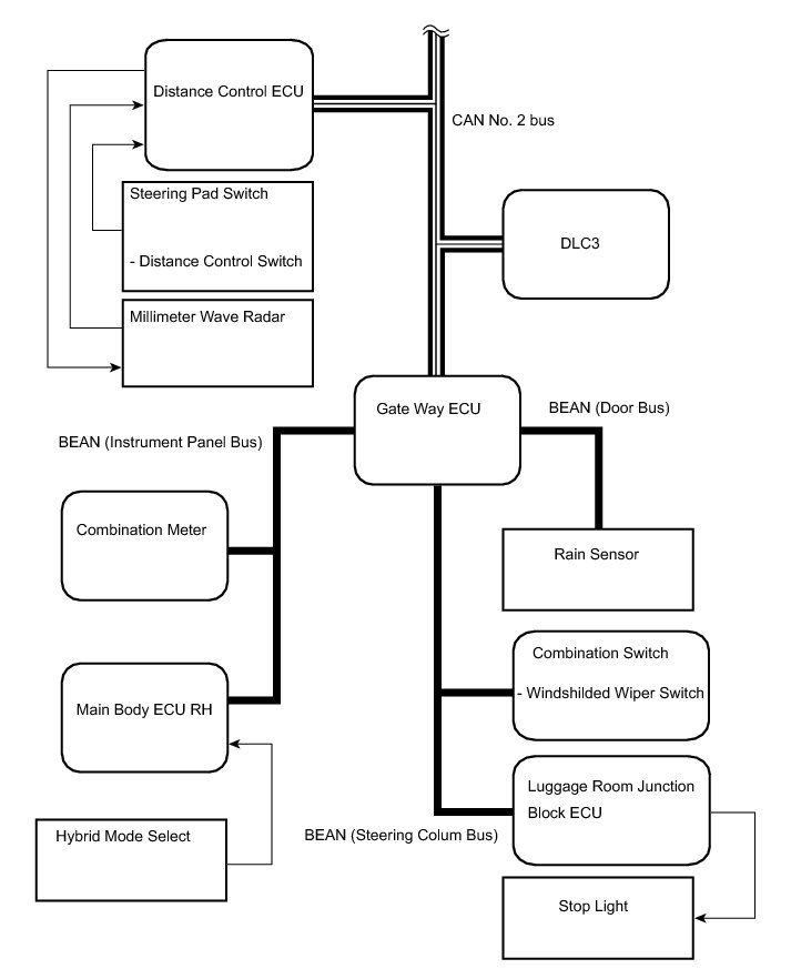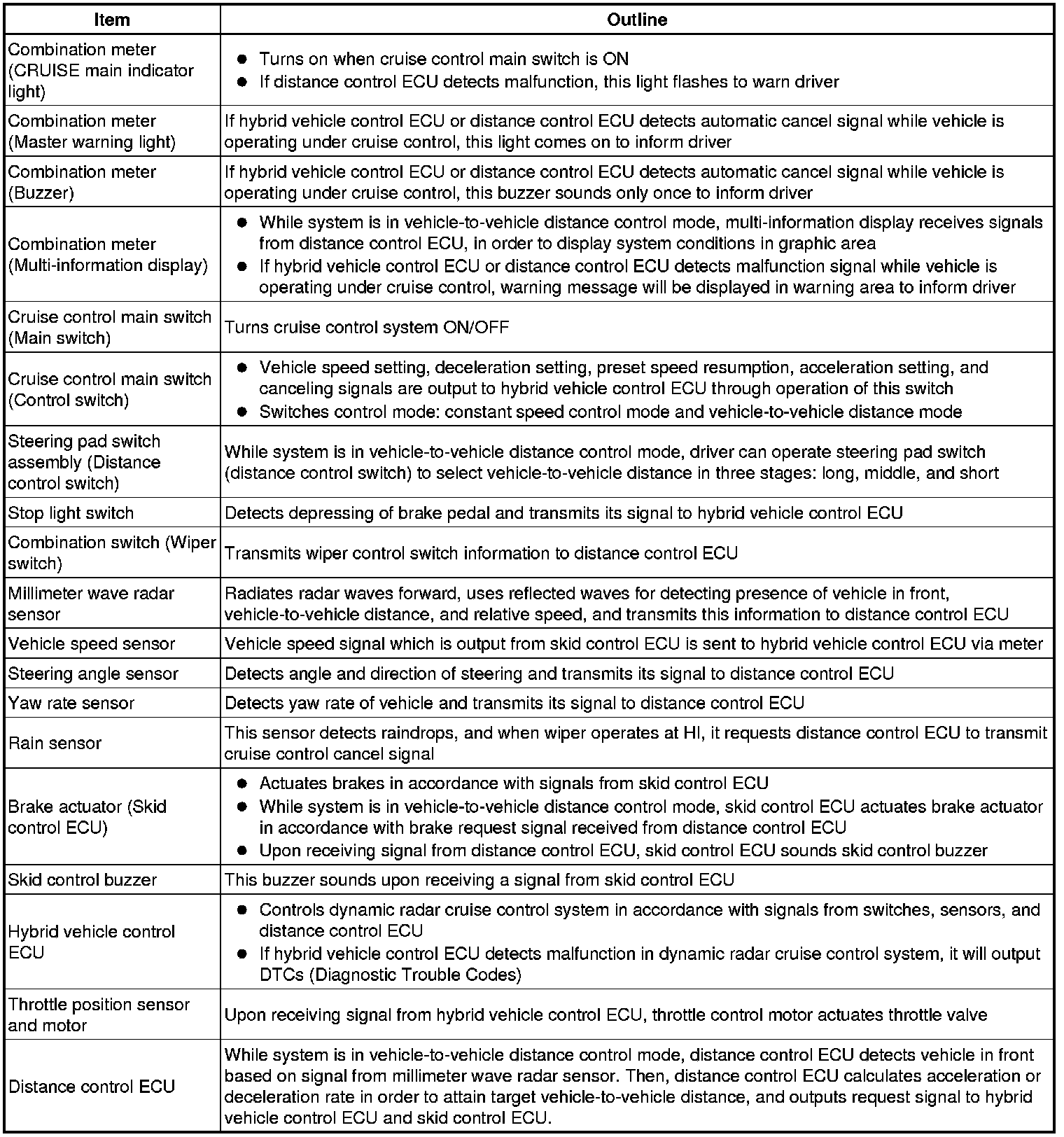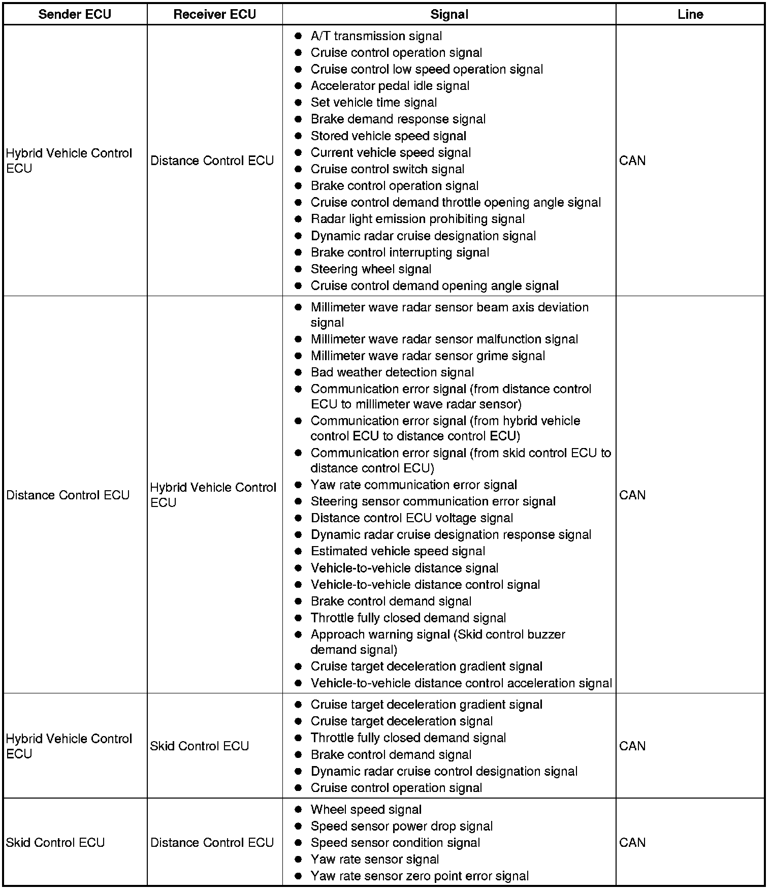 The distance control ECU determines the distance to the vehicle in front, relative speed, target decreasing speed and deceleration rate. Based on the data, the ECU may transmit a brake demand signal to the skid control ECU via the hybrid vehicle control ECU.
