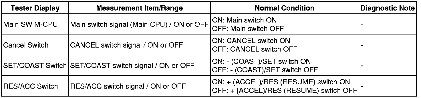 (e) Check the Data List for proper functioning of the cruise control main switch.