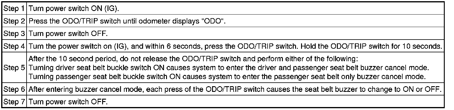 (a) The combination meter's buzzer operation can be customized. There is an ON and OFF setting, which sets or disables the driver's and / or front passenger's seat belt buzzer.