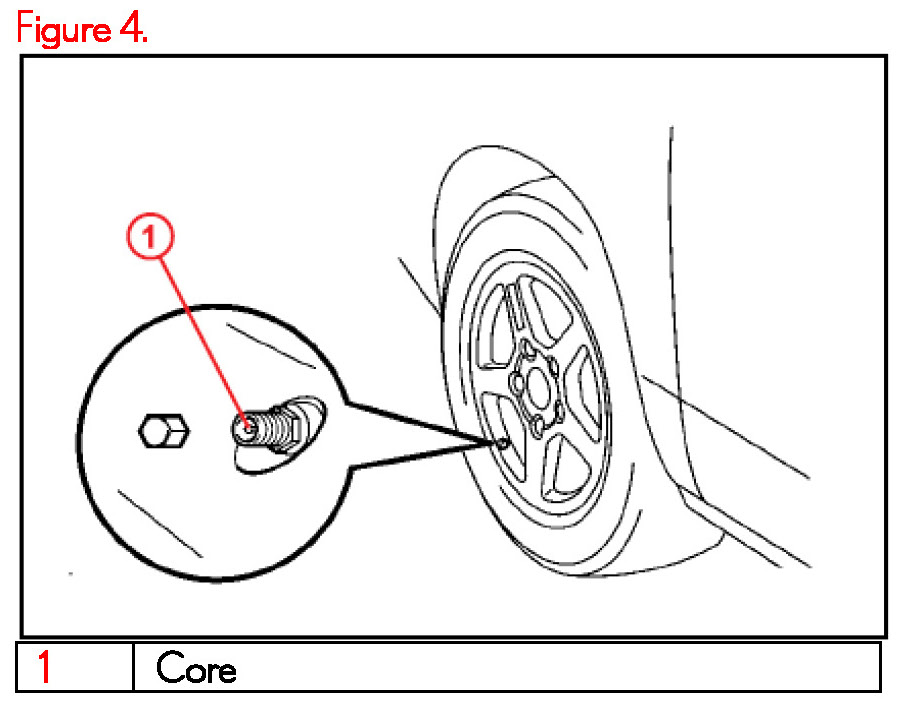 4. Press or remove the valve core to reduce the tire inflation pressure rapidly by 6 psi (0.4 kgf/cm2, 40kPa), or more, within 30 seconds.