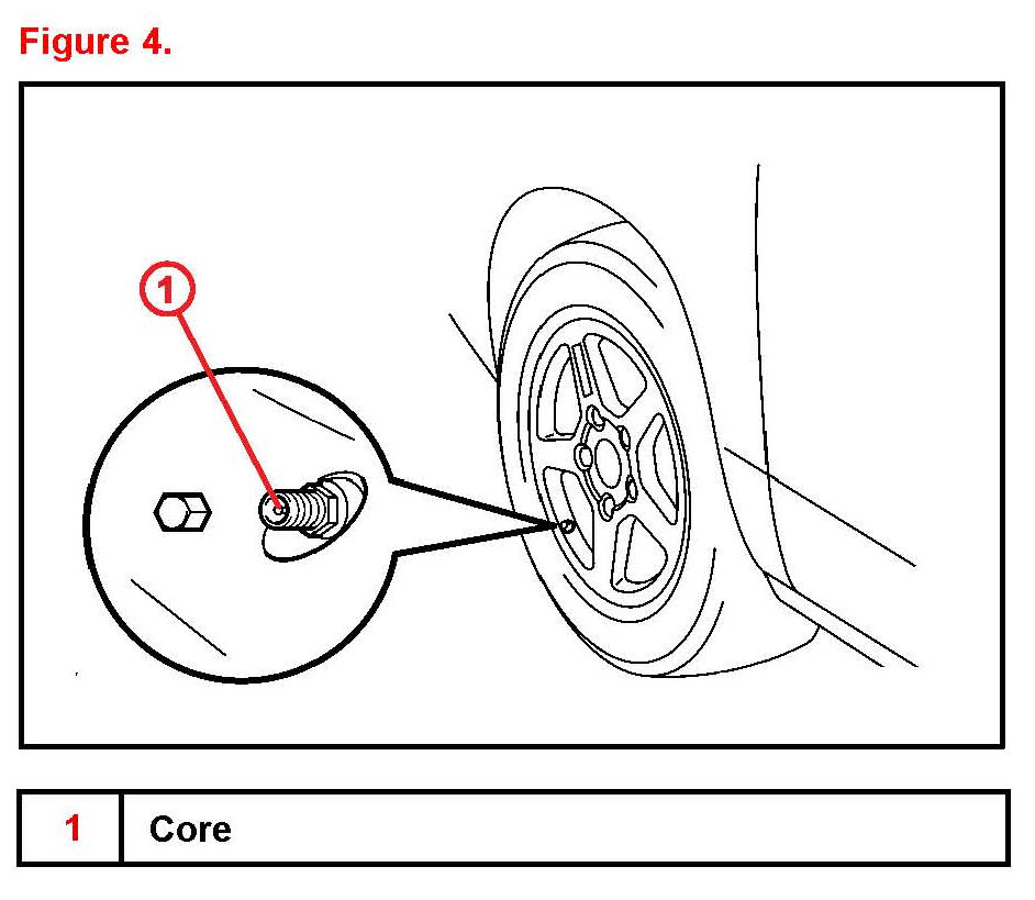 4. Press or remove the valve core to reduce the tire inflation pressure rapidly by 6 psi (0.4 kgf/sq.cm 40 kPa) or more within 30 seconds.