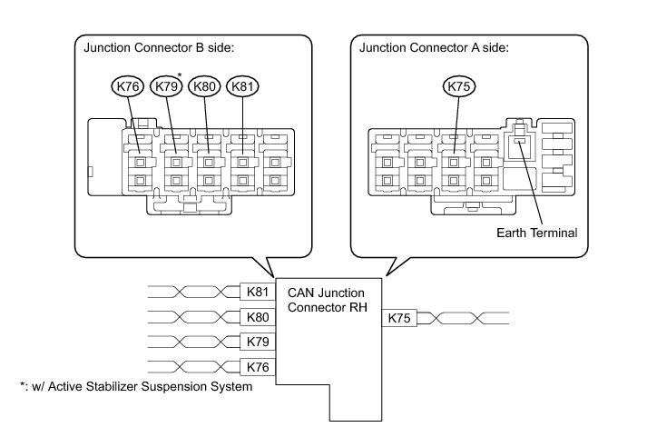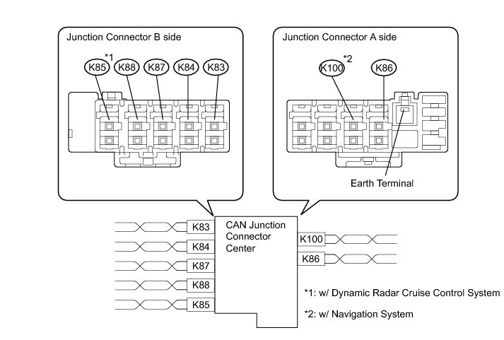 * The connectors connected to the junction connector can be distinguished by the colors of the bus lines and the connecting side of the connector.
