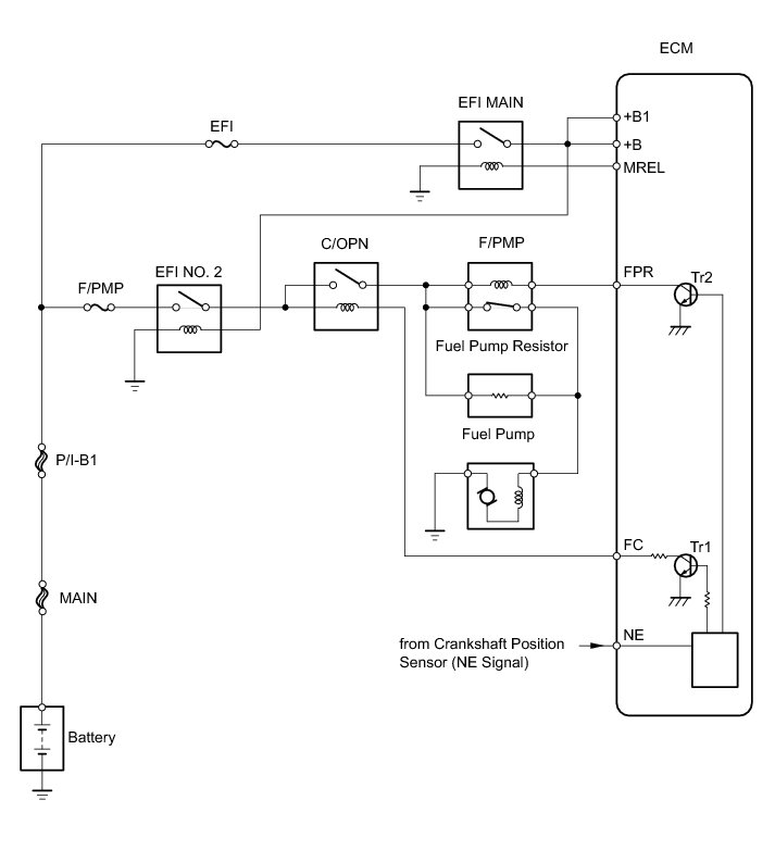 Based on vehicle driving conditions, the ECM operates the fuel pump. The ECM receives an engine start request signal from the power source control ECU. When the engine is started, an NE signal is sent to the ECM and the ECM connects the FC circuit to the body ground, operates the C/OPN (circuit opening) relay, and operates the fuel pump.