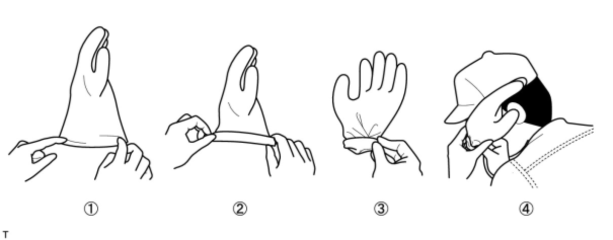 (2) Do not touch a bare cable that could be a high voltage cable. If the cable must be touched or if accidental contact is unavoidable, follow these instructions: 1) wear insulated or rubber gloves and goggles, 2) measure the voltage between the cable and the body ground using an electrical tester, and 3) insulate the cable using vinyl tape.