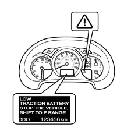 If the hybrid system fails to start, the master warning light flashes, and the multi-information display is as shown in the illustration, the HV battery may be depleted.