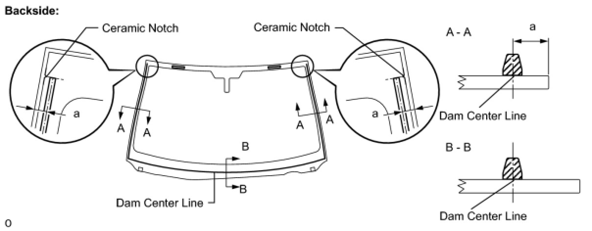 (b) Remove the peeling paper from the adhesive part of the dam. Install the dam (adhesive side) to the glass (Primer G area), but exclude the area above the notches on the upper part of the glass.