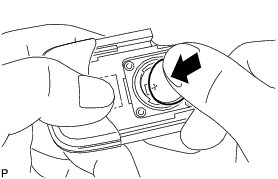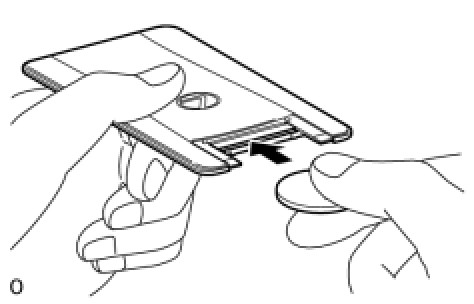 (a) Push in and install the transmitter battery (lithium battery) while being careful of the following: 1) the orientation of the battery positive (+) and negative (-) terminals; and 2) being sure to insert the battery between the 2 terminals and deep into the card, in the direction shown by the arrow in the illustration.