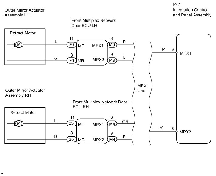 The integration control and panel assembly sends information about the operating condition of the mirror retract switch (switch input signals) through the BEAN line. Then the switch input signals are sent to the front multiplex network door ECU LH and RH.
